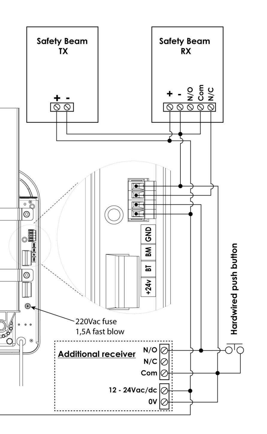Examining the manual and visually inspecting the garage motor itself reveals a convenient header providing power and input (labelled “Hardwired push button” below), this being what I like to call the Shelly Zone™.