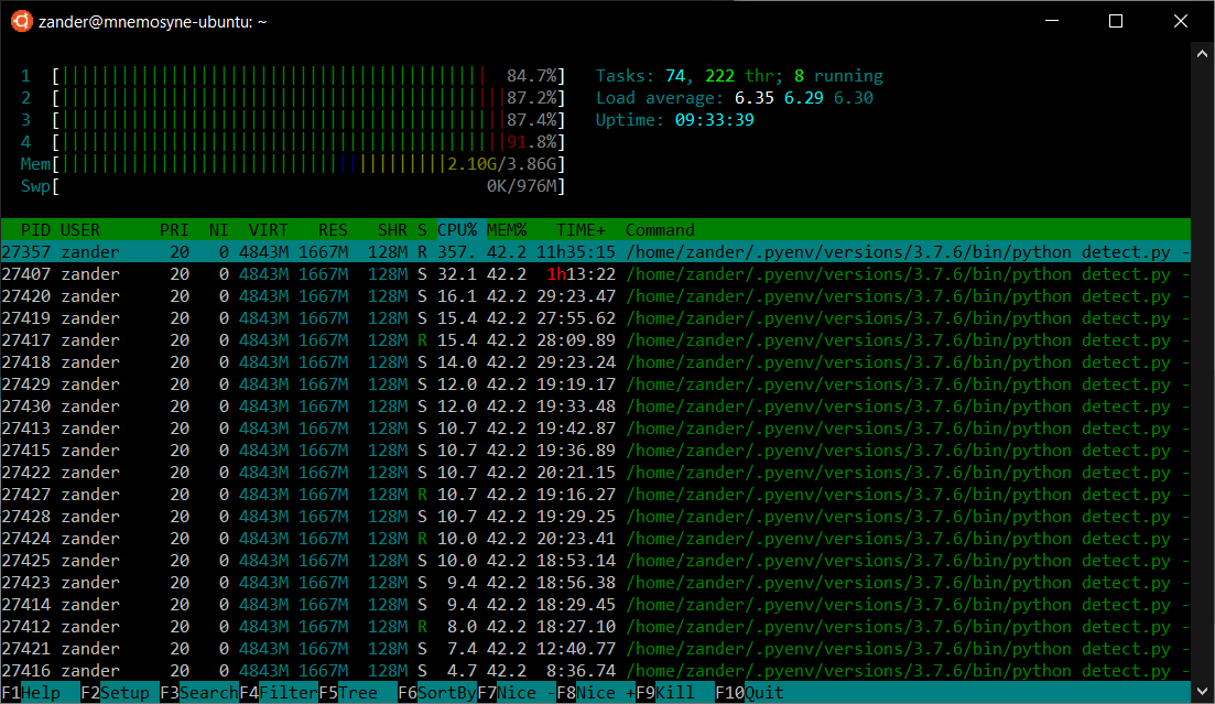 The detector runs quite well when dealing with h.264 streams, in my case, three 1080p25 and one 1520p25 stream. My cameras originally ran h.265, but my VM could not reliably decode all streams without hardware assistance (VM is running okay with 4 threads on a Xeon E3-1230v2 as seen below). All streams are processed in about 5 to 7 seconds when using 608x352 input size to the network. Using 416x256 bumps that down to below 5 seconds in most instances.
