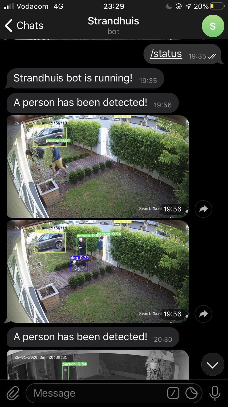 The code operates as two distinct entities: the object detector, and the telegram bot. The object detector is strongly derived from that provided in the original YOLOv3 repo, and needs quite a bit more work before I will be fully satisfied with it. The Telegram bot is vastly expanded from some standard boilerplate code, I’m insufferably pleased with it and all the little jokes nobody other than my wife and I will likely ever see. Unless you also run it. Please don’t judge the numerous sleeps scattered about, it’s so I can have the pleasure of having the bot show as typing at me.